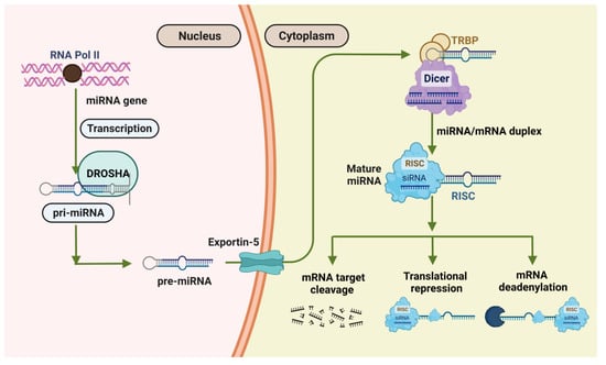 The degree of complementarity between the effector miRNA and the target mRNA influences the process of miRNA-mediated gene silencing. The effector miRNA directs miRISC to the target mRNA. In summary, there are three stages to miRNA biogenesis. The first occurs in the nucleus due to the nuclear RNase III enzyme Drosha cleaving an 80 nt primary or primiRNA translated from the genome [116]. Pre-miRNA is created. As a result, a 60–70 nucleotide stem-loop intermediate is actively transported into the cytoplasm by Ran–GTP and Exportin–5. The RNase III endonuclease Dicer complex breaks down pre-miRNA in the cytoplasm, producing a 20–22 nucleotide double-stranded fragment incorporated into the RNA-induced silencing complex (RISC). The 3’ UTR on target messenger RNA (mRNA) transcripts is where the five regions of miRNAs bind. Frequently, this results in translational inhibition or mRNA destruction (Figure 5) [117].