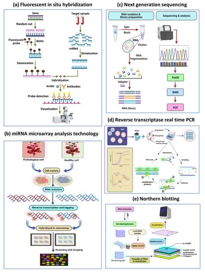 A well-known miRNA detection technique is Northern blotting (NB), which was used in the initial identification of a miRNA. It can be used to detect miRNA precursors in addition to mature miRNAs. The earliest attempt to methodically measure the expression profile of miRNAs was Northern blotting. It is widely used to visualize the expression of miRNAs of all lengths, from the long primordial miRNA to the mature form [120]. The method involves transferring the extracted RNA to a blotting membrane after first separating it by size using electrophoresis. Following the separation of the RNAs, the membrane is fixed, and sequences of interest are labeled by combining complementary DNA probes. Finally, hybridization with labeled, sequence-specific oligonucleotide probes is used to detect or quantify mature miRNAs. Once the free search has been washed, miRNAs can be identified using autoradiography or other appropriate methods [121]. The RNA was often crosslinked to the blotting membrane to increase the sensitivity of Northern blots. To crosslink RNAs to the nylon membrane, 1-ethyl-3-(3-dimethyl aminopropyl) carbodiimide (EDC) was used as an alternative, leading to a 25–50-fold increase in the sensitivity of miRNA detection. NB analysis has the advantage of implementing a multiplex miRNA detection method using color-coded detection probes, simultaneously detecting mature miRNAs and miRNA precursors [122].