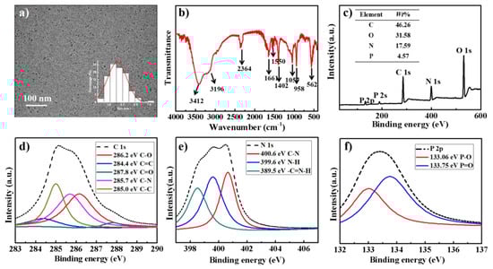(a) Transmission electron microscopy (TEM) image, (b) Fourier transform infrared spectrum (FT-IR) (c) X-ray photoelectron spectroscopy (XPS) spectrum, high-resolution (d) C 1s, (e) N 1s, and (f) P 2p spectra of PNCDs.
