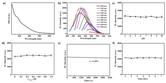 (a) Ultraviolet-visible (UV–vis) absorption of PNCDs, Fluorescence spectra of PNCDs at various (b) excitation wavelengths, (c) pH values, and (d) ionic strengths and (e) during 60 min of continuous irradiation and (f) during 7 days of storage. λex = 325 nm.