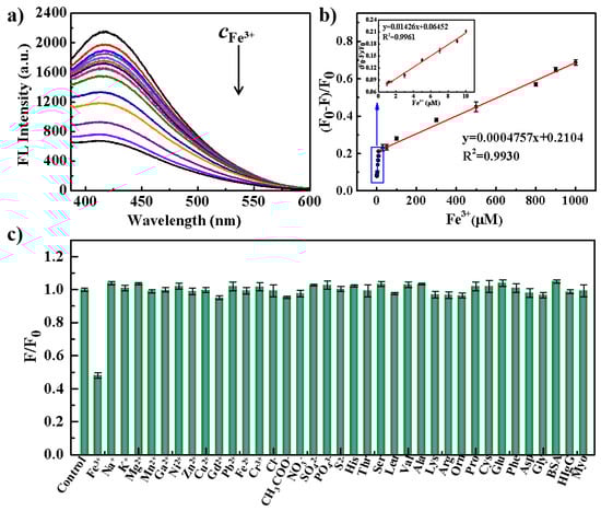 (a) Fluorescence responses of PNCDs in the presence of Fe3+ at different concentrations (0–1000 μM); (b) Linear relationships between fluorescence changes ((F0 − F)/F0) and Fe3+ concentration; (c) Fluorescence responses of PNCDs towards different species (500 μM ions, 100 μM amino acids, and 5 × 10−4 mg mL−1 proteins).
