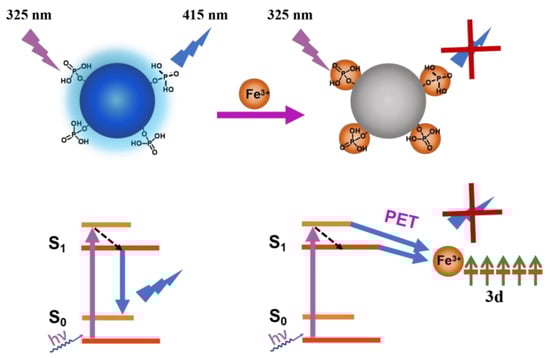 It is well known that most transition metals are apt to form complexes owing to the existence of empty d orbitals. Fe3+ possesses special 3d orbits with an electron-half-filled state and can coordinate with the phosphorus groups of PNCDs to form PNCD–Fe3+ complexes. Compared with other ions, the electron transferred from the excited state of PNCDs to the semi-filled 3d orbitals of Fe3+ is easier, promoting the recombination of nonradiative electron holes and resulting in fluorescence quenching, as illustrated in Figure 4. Moreover, the high selectivity of PNCDs towards Fe3+ sensing may also be related to the higher thermodynamic affinity of Fe3+ and the faster coordination process [51]. After the chelation sites of PNCDs are occupied by Fe3+, other metal ions, including Fe2+, are not easy to combine with PNCDs, thus contributing to the favorable detection selectivity to Fe3+. To comprehend the PL quenching process, the fluorescence lifetimes of PNCDs with/without Fe3+ were determined (Figure 5a). The average lifetime of PNCDs was 5.07 ns, which decreased to 2.52 ns when adding Fe3+. It was indicated that a photoinduced process of electron transfer occurs between PNCDs and Fe3+ [52].