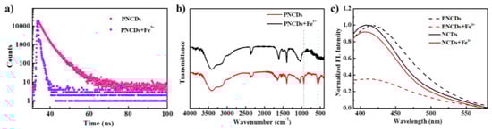 (a) Fluorescence lifetime decay curves of PNCDs before and after adding Fe3+. (b) FT-IR spectra of PNCDs before and after adding Fe3+. (c) Fluorescence responses of NCDs and PNCDs toward the addition of Fe3+.