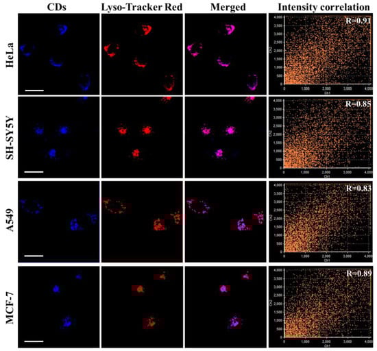 The distributions of PNCD were investigated in different cell lines, including HeLa, SH-SY5Y, A549, and MCF-7 cells. As can be seen in Figure 6, the blue CLSM images of PNCDs overlapped well with the red CLSM images of Lyso-Tracker Red, and the Pearson’s correlation coefficients were 0.91, 0.85, 0.83, and 0.89, respectively. The results clearly indicate that the PNCDs predominantly localized to lysosomes. The excellent co-localization results indicate that the PNCDs exhibit high lysosomal location specificity and can achieve universal lysosomal staining, regardless of the cell type. On the contrary, the co-localization regions of PNCDs with ER-Tracker Red and Mito-Tracker Deep Red were significantly different (Figure S6), with low Pearson’s correlation coefficients of 0.31 and 0.63, respectively. The lysosome targeting ability was attributed to the abundance of lipophilic amino groups [55,56], which enable PNCDs to access the cells and accumulate in intracellular acidic regions due to their acidophilic effect [2,57,58]. Lysosomes are acidic organelles that can provide protons, and the protonation of the amino groups of PNCDs takes place under acidic conditions, leading to the localization of PNCDs around lysosomes following internalization [40].