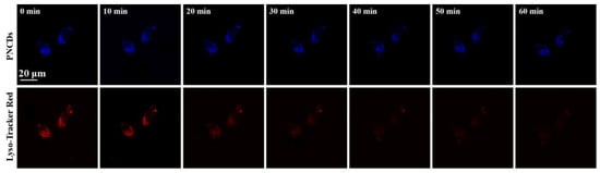 Figure 7 illustrates the photostability of PNCDs in cell imaging. It can be seen that the fluorescence of PNCDs remained unchanged within 60 min, while obvious fading of Lyso-Tracker Red fluorescence was observed at imaging times longer than 20 min. The excellent anti-photobleaching property of PNCDs makes them promising probes for the long-term monitoring and tracking of lysosomes.