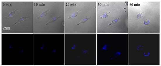 It has been reported that apoptosis can affect the function of lysosomes, and the increase in total lysosome volume is a common feature of apoptotic processes [59,60]. Dexamethasone is an anti-inflammatory agent that can induce cellular apoptosis due to proton leakage [35]. Figure 8 shows the results from the imaging of HeLa cells after a dexamethasone treatment. It can be clearly observed that the cell shape changed from spindle (in normal healthy cells) to circle (in affected cells). Meanwhile, the fluorescence images indicate that the volumes of lysosomes were significantly enlarged to the point of rupture during the cellular apoptotic death process, which was accompanied by changes in fluorescence intensity and location. The successful real-time tracking of lysosome morphology in HeLa cells sufficiently demonstrated the great potential of the as-prepared PNCDs for application as powerful probes in cytology.