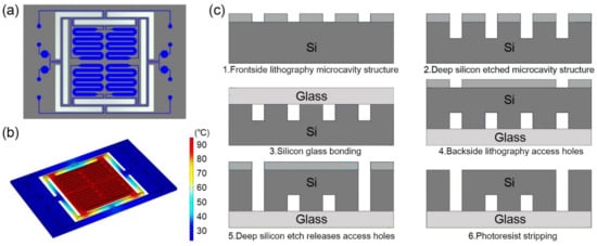 (a) Schematic diagram of the microfluidic chip. The chip is composed of four serpentine-shaped microchannels, and the buffer pool at the outlet can store the excess reagents. (b) Thermal simulation diagram when heating to 95 °C. The design of the insulation trench can make the main part of the chip maintaining temperature uniformity. (c) Schematic diagram of processing flow of microfluidic silicon-based chip.