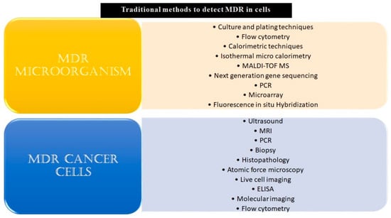 Given the challenges MDR poses by burdening healthcare systems, it is highly pertinent to develop technologies that can opportunistically screen/identify MDR strains, especially during the early stages of their onset, and monitor them. The existing methods to detect microbial and cancer MDR include culturing and plating techniques, ELIZA, biopsy, MRI, PCR, histopathology, next-generation sequencing techniques, and others, as listed in Figure 1.