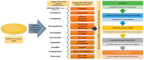 While antimicrobial resistance/antibiotic resistance (AMR/AR) is the ability of microorganisms to remain unaffected by a single AM or an antibiotic, MDR is the phenomenon where a microbe acquires non-susceptibility to at least one AM agent in a minimum of three categories [28]. XDR (Extremely Drug Resistant) pathogens remain susceptible to only one or two AM categories, whereas PDR (Pan Drug Resistant) expressing microbes show non-susceptibility to all agents in all AM categories [28]. Using S. aureus as an example, Figure 2 elaborates on how these distinctions are made.