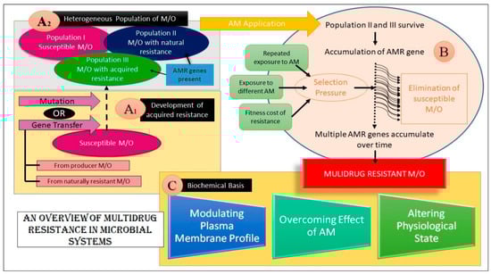 An overview of MDR in microorganisms. (Key: M/O- Microorganism(s), AM- Antimicrobial, AMR- Antimicrobial Resistance) The figure aims at explaining MDR emergence in microbes. Sections A1 and A2 depict how an assortment of microbes are present in the natural pool. This heterogeneous pool harbors some microbes that are susceptible to AM action, while some of them are resistant to AM agents. This resistance may be either innate or acquired. As shown, these AMR genes may be acquired from transfer from resistant/producer M/O or may be endowed by mutation. Block B shows how the resistant group survives upon AM application and procreates, leading to the accumulation of AMR genes. Over time, selection pressure is applied wherein the susceptible microbes get killed and multiple AMR genes accumulate in the M/O, imparting MDR. These genes dictate alterations to the subject by various means, finally yielding a multidrug-resistant microbe, as shown in section C.