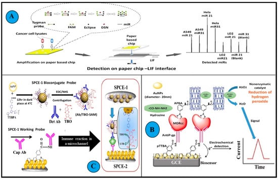 Another highly sought-after method of MDR analysis is detecting and monitoring micro-RNA (miR) levels. miRs are short, non-coding, and highly conserved RNA moieties that function in post-transcriptional gene regulation via translational repression and mRNA degradation [156]. miRs may be expressed constitutively or produced only under specific circumstances differentially [157]. Fluctuations in miR levels in the case of MDR variants are described in Table 3. Hence these molecules are ideally suited to detect MDR in malignant cells. Cai et al. developed a microfluidic-based laser-induced fluorescence sensor to determine miR-21 and miR-31 levels in HeLa and A549 cell lysates in real-time, with an LOD of 0.20 fM and 0.50 fM for miR-21 and miR-31, respectively [158]. Yaman et al. developed disposable AuNP peptide nanotubes-based biosensors for detecting miR 410 in serum and prostate cancer cell lines. In minutes, these impedimetric biosensors could detect the miR to the femtomolar limit [159]. It was observed that major feats have been achieved in the development of fluorescence-based biosensors in the detection of miRs This can be attributed to such biosensors exhibiting fast response, multiplexed ability, having simple instrumentation and operation, high selectivities and specificities, a non-destructive nature, and they can be easily integrated with microfluidic platforms [21,160].