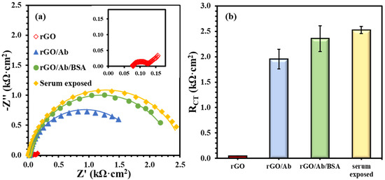 The immunoplatform on rGO screen-printed electrode was prepared by immobilizing anti-Nf-L antibody on the electrodes using the electrografting method [27,28]. Figure 1 presents the formation of the biorecognition layer comprising bare rGO, antibody (anti-Nf-L) onto rGO, and BSA treatment of the immobilized antibody. Figure 1a shows the Nyquist form of the EIS plots of main layers, i.e., electrode (rGO), antibody (G/Ab), complete biolayer (rGO/Ab/BSA), and human serum exposed biolayer. Figure 1b summarizes the impedance of each layer, i.e., charge transfer resistance (RCT), emerged from steric hindrance to the soluble redox probe. The unmodified rGO surface has extremely low resistance (0.040 ± 0.003 kΩ·cm2), which increased almost two orders of magnitude (1.95 ± 0.20 kΩ·cm2) after covalent immobilization of the anti-Nf-L on the electrografted rGO surface. After the exposure of rGO/Ab to 1% BSA, the resulting rGO/Ab/BSA biolayer had an impedance of 2.4 ± 0.25 kΩ·cm2 with RSD ~ 10%. The purpose of BSA in preparing such platforms is to reduce non-specific adsorption. However, the 10% relative error indicates that the platform is prone to a high rate of false-positive signals. Then, we exposed the rGO/Ab/BSA biolayer to an undiluted commercial human serum followed by washing with the buffer. The exposure to the human serum significantly improved the precision of the biolayer response, i.e., 2.5 ± 0.07 kΩ·cm2 and RSD ~3%. Rationally, human serum is more biologically relevant toward biorecognition layer and the serum exposure may have covered some exposed rGO surface left after the adsorption of BSA [32].