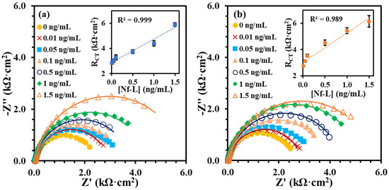 EIS signals of the synthetic Nf-L target captured at the immunoplatform from concentration range (0.01 to 1.5 ng/mL) in buffer medium PBS pH 7.4 (a) and in serum (b). The insets in (a,b) show corresponding calibration plots of RCT vs. concentration. Each error bar represents n ≥ 3 replicates.