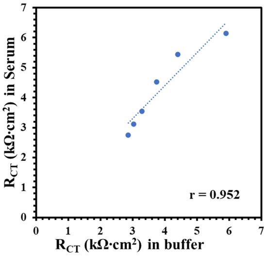 The Nf-L concentration in human serum has been reported in the range 0.05–0.879 ng/mL for early-stage ALS and 0.02–4.2 ng/mL for late-stage ALS patients [33,34]. Despite the wide and varied ranges of Nf-L concentration in human serum, the median values for both stages are very similar, i.e., 0.26 ng/mL and 0.2 ng/mL, respectively. Clinical serum has a complex matrix, which makes it highly challenging to detect the target biomarker. Protein enrichment is needed for the detection of low abundant target in serum. However, sample preparation may result in quantitative loss of molecule of interest [35]. It is critical to know that buffer-based calibration model usually do not relate with real sample matrix, such as serum samples. To better understand the matrix effect on the immunoplatform, it is important to compare a buffer-based calibration with a serum-based calibration. It was assumed that an appropriate regression model may be around the reported median value of the Nf-L in serum. Therefore, we prepared and analyzed the synthetic Nf-L target in concentration range of 0.01–1.5 ng/mL prepared in PBS buffer and filtered human serum. Figure 2a shows EIS signals of the synthetic Nf-L target in PBS buffer. The increase in RCT signal with the concentration confirms the immobilization of the target on the immunoplatform. The dynamic response was observed in the concentration range that can be observed in the calibration curve shown in inset of Figure 2a. The limit of detection (LOD) was calculated as 0.39 ng/mL (S/N = 3) from linear regression equation (y = 1.9x + 2.9) obtained in the buffer medium. Figure 2b represents EIS response of the synthetic Nf-L protein prepared in human serum along with the regression curve in the inset. The response of the concentrations were higher in the serum medium, which was expected due to the complexity of the medium. Nevertheless, the sensitivity (slope) of the curve was higher (y = 2.4x + 3.0) and LOD was calculated as 0.087 ng/mL (S/N = 3), which is one order of magnitude better than that of the buffer medium. We assume that the better precision of the serum-exposed biolayer improved the LOD from serum-based calibration plot due to similar matrix. We performed comparative analysis of RCT signals of two data sets obtained from serum and buffer calibration media and found no significant difference in variance (p > 0.08) and in means (p > 0.6). This further verifies that the results obtained from both media are correlated. The correlation between the RCT signals obtained from buffer and serum-based calibration curve (Figure 3) shows that both calibration models are reasonably correlated as indicated by the Pearson correlation coefficient r = 0.952. Of note, we used monoclonal anti-Nf-L antibody, which is very specific to its target antigen. Therefore, we expected no significant nonspecific interference, which was verified by the high correlation between the buffer and serum matrix results. Due to the correlation, we used both regression models to calculate concentrations of Nf-L in the diluted sera samples from ALS patients.