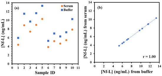 (a) Plot of target Nf-L concentration in ALS serum samples. The concentrations calculated from serum-based calibration plot (orange circle) and buffer-based calibration plot (blue square). (b) shows correlation plot between the concentration of Nf-L in real ALS samples calculated from serum-based calibration model versus buffer-based calibration model. Pearson correlation coefficient r = 1.00 shows very high correlation between these two media.