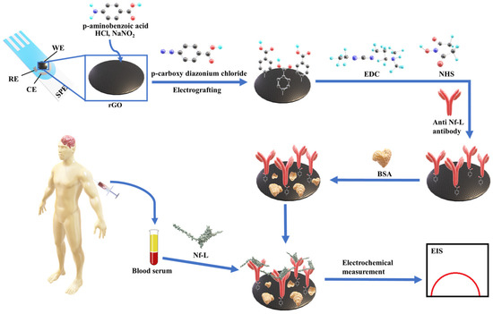 A biorecognition layer was prepared on the reduced graphene oxide (rGO) screen-printed electrode (SPE). The SPE comprised of an rGO working electrode with 4 mm diameter, a carbon counter electrode, and a silver pseudoreference electrode. The rGO working electrode was first modified with carboxyphenyl group using electrografting method [27,28]. First, 2 mM of NaNO2 was added into 2 mM of 4-aminobezoic acid prepared in 0.5 M HCl to generate diazonium cation. After 5 min of reaction, 150 μL of the solution was dropped on to the rGO surface. Covalent immobilization of 4-carboxyphenyl group was obtained by electrografting using cyclic voltammmtery (CV) from 0.4 to −0.6 V for 3 cycles at 200 mV/s scan rate. For anti-Nf-L antibody immobilization, 10 μL of 100 mM EDC and 20 mM NHS prepared in 100 mM MES buffer (pH 5) was dropped on carboxy phenyl modified rGO surface and the electrode was incubated around 8 °C for 1 h. The surface was carefully washed with MES buffer followed by incubation of 10 μL of 20 ng/mL anti-Nf-L antibodies, prepared in 1× PBS buffer (pH 7.4) for 3 h at 8 °C. Then, the surface was washed with PBS buffer and exposed to 10 μL of 1% BSA as a blocking layer for 1 h followed by washing with PBS buffer. The biolayer was also exposed to 10 μL undiluted serum for 15 min followed by washing with PBS buffer. Synthetic Nf-L targets in the concentration range 0.01 to 1.5 ng/mL were prepared in 1× PBS and in serum separately and were immobilized in respective biorecognition layer for 15 min followed by washing with PBS buffer.