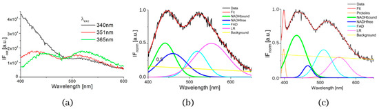 (a) Fluorescence spectra of suspension of living human liver carcinoma cells SNU475 (c = 2 × 105 cell/mL) in PBS excited at 340, 351 and 365 nm, (b) GASpeD decomposition of the normalized fluorescent spectra excited at 365 nm, (c) GASpeD decomposition fluorescence spectra excited at 351 nm.