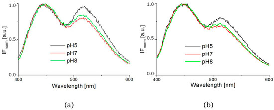 Intensity of fluorescence normalized spectra measured in buffers (pH = 5, 7 and 8) (a) 3T3 cells, (b) CT26 cells.