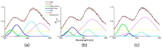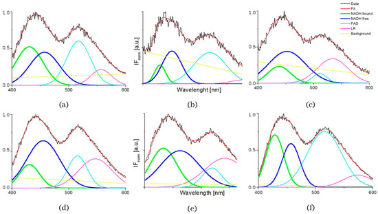 The typical measured normalized fluorescence spectra of samples of SNU475 human liver carcinoma cells and the calculated four curves with background by GASpeD are in Figure 1. This figure shows the fluorescence spectra of the cell suspension excited at 340 nm, which is the maximum absorbance of NADH [14]. Excitations of cell suspensions with light of wavelength 351 nm were used in a previous study [28] and, in the case of excitation at 365 nm, the fluorescence of NADH was obviously less influenced by the fluorescence of pyridoxine and tryphophane [6,42]. Fluctuations in measured spectra (black lines) were dependent on the homogeneity of the sample caused by variations in number, shape, and size of the cells. This is reflected in the calculated background (yellow line). We assigned calculated curves as NADH free, NADH bound, FAD and LR (lipofuscin, riboflavin and other lipopigments) [30], because their maxima fitted well with known absorption peaks of these cell components (NADH bound 435, free 460 nm) [6,8,48]. The fluorescence spectra of living cells were strongly dependent on the excitation wavelength as shown in Figure 1a. A change in the excitation wavelength resulted in completely different GASpeD decomposed spectra (Figure 1b,c). In the case of excitation with a wavelength of 365 nm, the best fit, with measured spectrum, was 4 peaks and background. However, for excitation with a wavelength of 351 nm, the best fit was 5 peaks and background. The fifth peak corresponds to the fluorescence of further biofluorophores, mainly pyridoxine and tryptophan. The same results were shown in previous papers [6,49]. In preliminary experiments with pure fluorophores [42], we found that the fluorescence of NADH was minimally influenced by the fluorescence of tryptophan and pyridoxine when excited at 365 nm. Excitations at 365 nm were also used in other fluorescence-based studies on the content of free and bound NADH in living cells [6,42,49]. Typical decomposed normalized fluorescence spectra of healthy 3T3 and carcinoma CT26 cells (excitation at 365 nm) are shown in Figure 2.