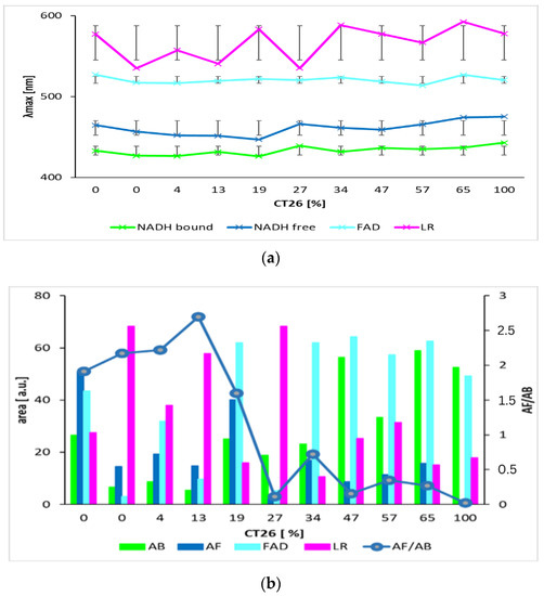 The contents of free and bound NADH were characterized as areas below the calculated Gaussian curves (AB = NADH bound and AF = NADH free). The AF/AB ratios of these areas were from 2 to 25 for 3T3 healthy cells, and from 1 to 0.07 for CT26 carcinoma cells. These ratios are in contrast with previous studies [49], which determined the higher ratio of free/bound NADH in cancer cells rather than in normal cells. This has been explained in terms of the prevalence of anaerobic metabolism in cancer cells. This condition involves fewer stages of interaction between coenzymes and enzymes than in aerobic metabolism. Consequently, the ratio of free/bound NADH is higher in anaerobic cells than in aerobic cells.
