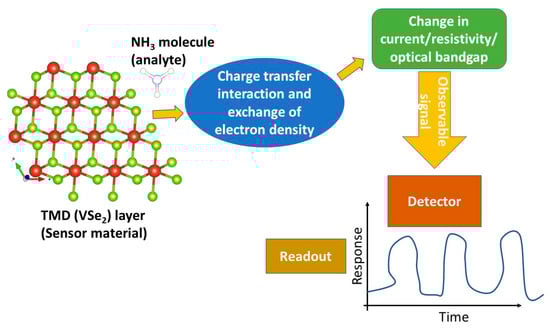 The charge transfer between adsorbate and adsorbent partakes in the gas sensing mechanism (Figure 1). Previous studies showed that the gas-sensing behavior of two-dimensional can be improved by introducing p-type or n-type doping [,,,]. The doping can be introduced by incorporating impurities in the two-dimensional nanomaterial lattice [,]. Suh and his group reported the hole generation in the MoSe2 monolayer with the doping of Nb in the lattice structure []. The gas-sensing behavior of Nb-doped MoS2 nanosheets has been investigated by Choi and his coworkers []. Their report stated that optimum NO2 sensing of MoS2 can be enhanced up to 8% with Nb doping and hence, can be considered an effective way to achieve high-performance gas sensing devices. The improvement of the gas-sensing behavior of MoSe2 and MoTe2 nanomaterials with the elemental substitution is also reported in the past []. The role of V, Nb, and Ta-doped MoS2 in NH3, H2O, and NO2 sensing has been studied by Zhu and his group []. Authors suggested that doping of transition metal atoms enriches the sensing properties of MoS2. The effect of Al, Si, and P-doped MoS2 on the adsorption as well as sensing of NH3 has been studied by Luo and his group []. The effect of nitrogen, phosphorus, and arsenic doping on the CO, NO, and HF sensing of Janus WSSe nanosheets has been studied in the past using DFT methods []. The studies showed that ~3.12% doping of nitrogen, phosphorus, and arsenic makes Janus WSSe nanosheets efficient sensing materials even without imposing external strain. The utilization of VSe2 nanomaterial for the sensing of nitrobenzene and catechol has been reported in past studies [,]. Vacancy engineering has been reviewed as a critical strategy for tuning electron and phonon structures of two-dimensional materials in general and for gas-sensing applications in particular [,,]. For instance, in the case of TMDs, the introduction of vacancy has been reported to be beneficial for the sensing of SO2, NH3, NO2, ‘NO, O2, and CO, and decomposed SF6 gases in SnSe2, SnS2, MoS2, PtSe2, and WS2 layered systems, respectively [,,,,]. Keeping the above in mind, the potential of vacancy-engineered VSe2 for the detection of NH3 appears to be a still unaddressed topic, to the best knowledge of the authors.