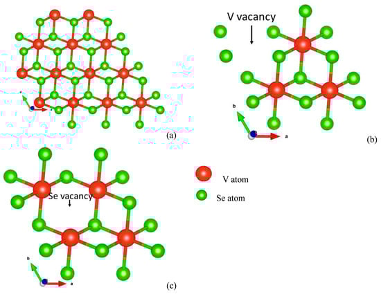 Relaxed structure of (a) pristine VSe2, (b) VSe2 deficient with V atom, and (c) VSe2 deficient with Se atom.