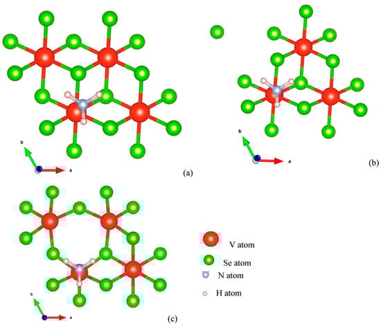 Relaxed structures of (a) NH3 (N atom directly placed above V atom) on pristine VSe2, (b) NH3 (N atom directly placed above V atom) on VSe2 deficient with V atom, and (c) NH3 (N atom directly placed above V atom) on VSe2 deficient with Se atom.