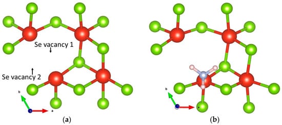 Relaxed structures of (a) VSe2 deficient with 2 Se atoms and (b) NH3 (N atom directly placed above V atom) on VSe2 deficient with 2 Se atoms.