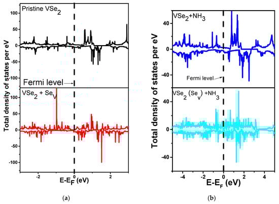 In order to get insights regarding charge transfer and the interaction mechanism of NH3 with pristine and defected VSe2, we have presented total and partial density of states analyses. The TDOS plot of a pure VSe2 monolayer is specified in Figure 3a. To determine the magnetic behavior, spin-up and spin-down states are plotted. It is observed from the figure that the pure material is magnetic due to the asymmetry in spin states. The existence of the density of states at the fermi level implies the metallic behavior of the materials, consistent with earlier findings [,]. The total density of states enhanced by the adsorption of the NH3 molecule on VSe2 is shown in Figure 5a. In the case of the VSe2(Sev) system, an enhancement in TDOS is observed below the Fermi level, as depicted in Figure 5b. The enhancement in the density of states occurs due to the unbound V-atom bonds after the removal of the Se atom from the monolayer. The change in the density of states with the adsorption of NH3 supports the orbital interactions. The density of states is also enhanced at the fermi level with the adsorption of NH3 on the VSe2(Sev) system.