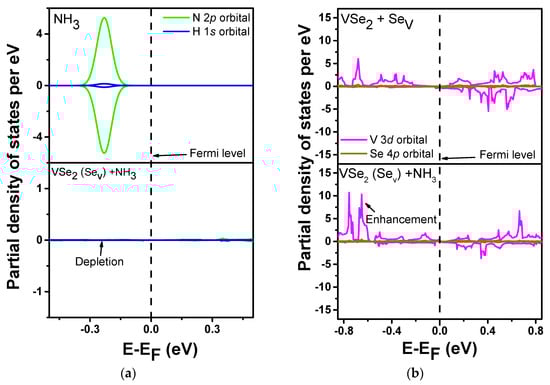 To investigate the orbital interactions, the spin-polarized partial density of states (PDOS) is analyzed. The spin-polarized partial density of states (PDOS) for N-2p and H-1s orbitals in NH3 and VSe2(Sev) + NH3 were computed and are shown in Figure 6a. In the case of the NH3 molecule, the partial density of states for N-2p and H-1s orbitals is spotted in the valence band. These partial densities of states disappeared (or were reduced) with the adsorption of NH3 on the VSe2(Sev) monolayer. Further, the spin-polarized partial density of states (PDOS) of V-3d orbitals for VSe2 + Sev and VSe2(Sev) + NH3 were computed and are shown in Figure 6b. On comparing the PDOS of V-3d orbitals of VSe2(Sev) and VSe2(Sev) + NH3 systems, it can be observed that the densities of states are enhanced in the latter with the adsorption of the NH3 molecule. This suggests that the monolayer is acting as an electron acceptor, whereas NH3 is acting as an electron donor. So, we can say that there is a charge transfer from NH3 to VSe2(Sev) due to the adsorption of NH3.