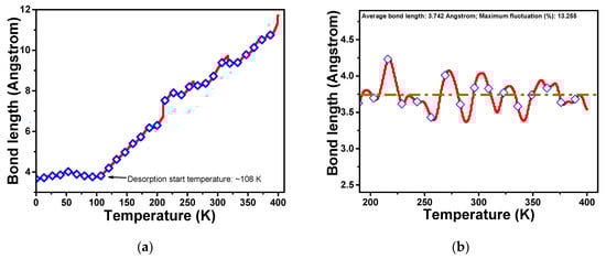 The bond length fluctuations (between N of NH3 and V of VSe2) with the temperature are plotted in Figure 9. We can notice that for pristine VSe2, the NH3 molecule goes away from the system starting with a temperature of 108 K. It seems that the NH3 molecule desorbs from the system once the temperature is increased, with desorption starting around 108 K. This is because NH3 is bonded very weakly on pristine VSe2 and goes out of the system at higher temperatures. So NH3 desorbs from the system below room temperature for pristine VSe2. So, pristine VSe2 is not suitable for NH3 sensing due to weaker interactions and low adsorption energy. But for VSe2(Sev) + NH3 system, the bond length fluctuations are not much. It is around 10% of the mean value, suggesting that adsorbed NH3 remains intact at 300 K and even up to 400 K on the sensing material. This is due to the fact that the adsorption energy of NH3 on defected VSe2 has increased from −0.12 eV for the pristine system to −0.97 eV for the VSe2(Sev) system. Strong adsorption energy is due to charge transfer from NH3 to defected VSe2. So, the defected VSe2 is promising for NH3 sensing.