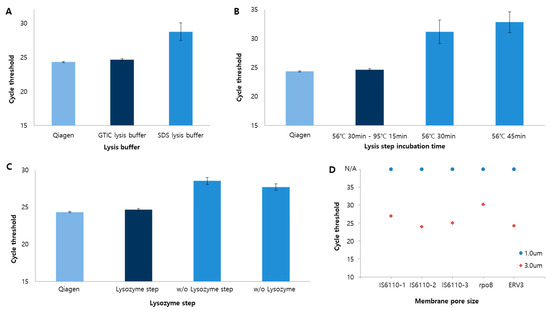 Optimization of the D-APDMS with syringe filter platform. (A) The efficiency of sample lysis depends on the lysis buffer. The results showed that the GITC lysis buffer (dark blue) was more efficient than the sodium dodecyl sulfide (SDS) lysis buffer. (B) Cell lysis is affected by incubation time and temperature. Upon testing under three conditions, the best results were obtained with incubations at 56 °C for 30 min and at 95 °C for 15 min (dark blue). (C) The efficiency of the lysozyme. Higher efficiency was obtained with the additional lysozyme step (dark blue). Data are presented as the mean ± SD based on at least three independent experiments. (D) The effect of pore size on DNA extraction efficiency.