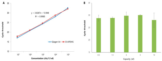 Application of the D-APDMS with syringe filter platform. (A) The efficiency of DNA extraction was confirmed at various concentrations. The test was performed for a concentration range from 1 × 107 to 1 × 103 CFU/1.5 mL using a Qiagen kit (blue) and the D-APDMS platform (red). (B) DNA extraction was tested using samples with volumes ranging from 0.5 to 10 mL. The data are presented as the mean ± SD based on at least three independent experiments.