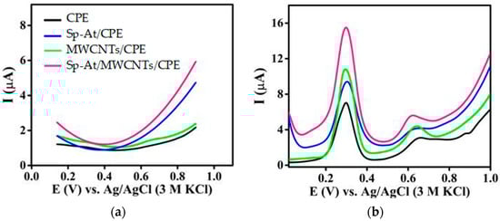 DPVs of CPE, Sp-At/CPE, MWCNTs/CPE, and Sp-At/MWCNTs/CPE in 0.1 M phosphate buffer (pH 4) at a scan rate of 0.1 V·s−1 in the (a) absence of GA and (b) presence of 30 μM GA.