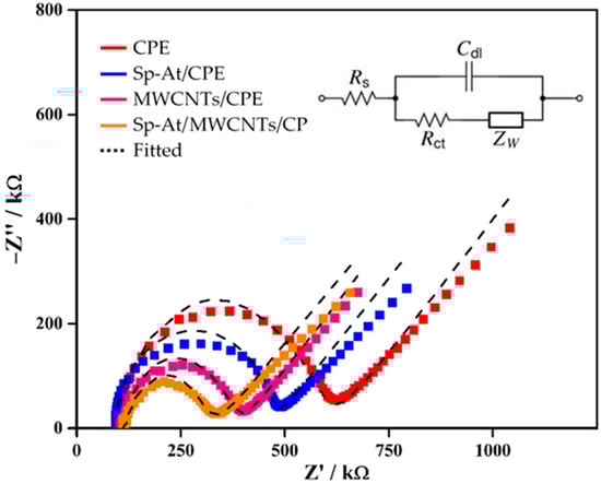 Nyquist plots of CPE, Sp-At/CPE, MWCNTs/CPE, and Sp-At/MWCNTs/CPE in a solution of 0.1 M KCl containing 5 mM [Fe(CN)6]3−/4− at the frequency range of 0.1 Hz–100 kHz, applied potential of 0.23 V and an amplitude of 5 mV. Inset: The Randles-equivalent circuit model.