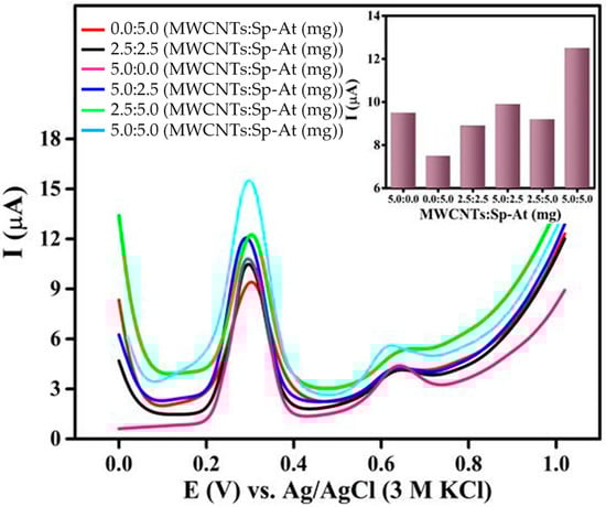 It is well known that the electrochemical behavior of modified carbon paste electrodes strongly depends on the mixing ratio, the way of preparing the carbon pastes, the duration of grinding, and homogenization [,]. In this regard, to improve the efficiency of the proposed sensor based on Sp-At/MWCNTs/CPE for detecting GA, the ratio of MWCNTs and Sp-At powder as modifiers was optimized (Table 1). Six electrodes with different ratios of MWCNTs and Sp-At powder were prepared, and the DPVs of the prepared electrodes were recorded in 0.1 M phosphate buffer, pH 4, in the presence of 30 µM GA. Figure 3 shows the responses of different electrode compositions in the similar electrochemical conditions. As can be seen, the amount of the two modifiers played an important role in the response of the sensors to GA. MWCNTs as modifiers enhanced the oxidation current of GA due to their large surface area and electrical and electrocatalytic properties. On the other hand, the 3D microporous sponges provided a larger specific surface area for atacamite as an electrocatalyst, facilitating the diffusion of GA toward atacamite and improving the electron transfer between GA and atacamite. Thus, the synergistic effects of MWCNTs and 3D Sp-At lead to a remarkable improvement in the sensing performance of Sp-At/MWCNTs/CPE. According to the obtained results, the CPE containing 10% (in a ratio of 1:1) MWCNTs and Sp-At powder showed the maximum oxidation current.