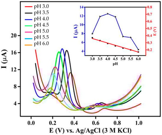 DPVs of 0.1 M phosphate buffer (pH of 3, 3.5, 4, 4.5, 5, 5.5, and 6) containing 30 μM GA at a scan rate of 0.1 V·s−1. Inset: effect of pH on oxidation peak current (blue) and oxidation peak potential (red).