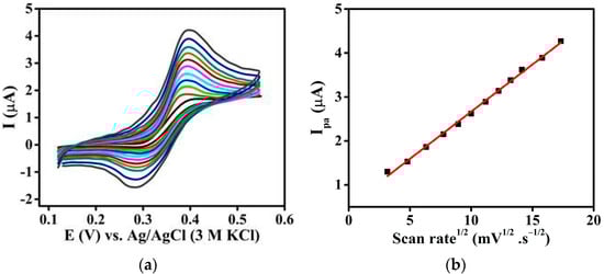 (a) CVs of Sp-At/MWCNTs/CPE in 0.1 M phosphate buffer (pH 4) containing 30 μM GA at different scan rates (20–300 mV·s−1). (b) The plot of the relationship between Ipa and the square root of the scan rate.