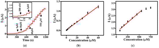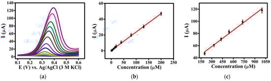(a) DPV responses of Sp-At/MWCNTs/CPE with successive additions of different concentrations of GA from 500 nM to 1 mM in 0.1 M phosphate buffer (pH 4) at a scan rate of 0.1 V·s−1, pulse amplitude of 0.1 V, and pulse time of 0.02 s; current–GA concentration calibration curve for (b) low and (c) high concentrations of GA.