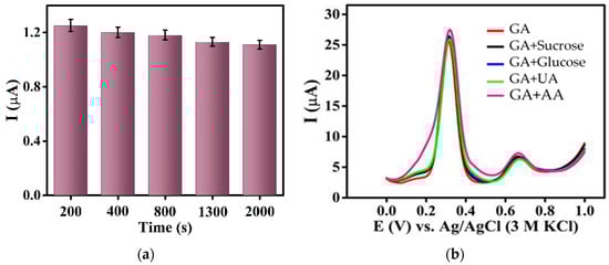 (a) Stability for long-term testing. (b) Interference test of 60 μM GA with 0.6 mM of some known interfering species.