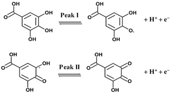 - Abdel-Hamid, R.; Newair, E.F. Electrochemical behavior of antioxidants: I. Mechanistic study on electrochemical oxidation of gallic acid in aqueous solutions at glassy-carbon electrode. J. Electroanal. Chem. 2011, 657, 107–112. [Google Scholar] [CrossRef]