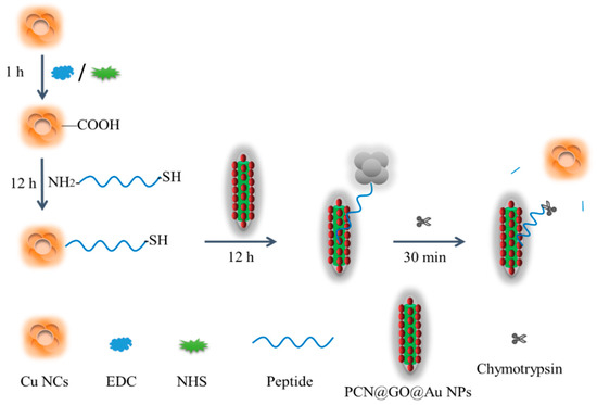 The PCN@AuNP@GO nanohybrid was prepared using GO layer coated onto the surface of PCN@AuNP based on strong π–π stacking and hydrogen bond interactions. Then, PCN@GO@AuNP and PCN@AuNP composite nanomaterials were used to quench fluorescence. Copper nanoclusters were prepared and activated by EDC and NHS. The amino group at one end of the peptide reacted with the carboxyl group at one end of the activated copper nanoclusters [38]. Then, the fluorescence of copper nanoclusters was quenched with hybrid materials, PCN@AuNPs@GO or PCN@AuNPs, based on FRET. The peptide with the fluorescence can covalently bind to the surface of the AuNPs of PCN@GO@AuNP and PCN@AuNP composite nanomaterials. The fluorescence was quenched by composite nanomaterials. Chymotrypsin cleaved the peptide. The target peptide (RRHFFGCEKEKEKEPPPPC) with alternating amino acid residues of negatively charged glutamic acid (E) and positively charged lysine (k) has attracted more and more attention due to its antifouling properties. Functional peptides can resist the non-specific adsorption of charged proteins on the surface of the sensor [39]. The fluorescence group will be far away from the surface of the composite nanomaterials. Therefore, the intensity of fluorescence was improved after chymotrypsin was added [14]. Figure 1 shows the principle of detection. Chymotrypsin can be detected with the change in fluorescence intensity after chymotrypsin was added.