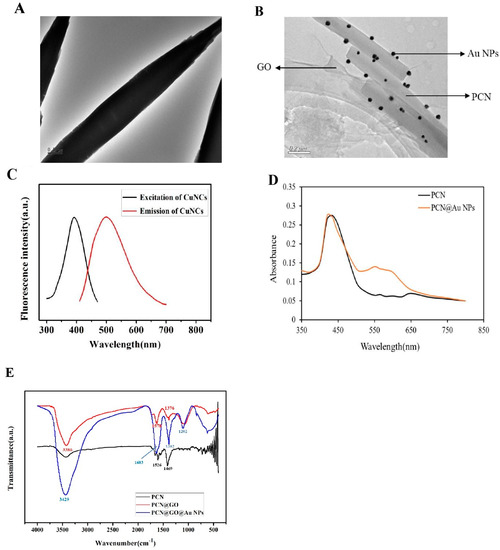 (A) PCN nanomaterial and TEM. (B) PCN@GO@AuNP composite nanomaterial and TEM. (C) Fluorescence excitation and emission spectra of CuNCs. (D) PCN@AuNP composite nanomaterial. (E) The peaks of hydroxy O-H were 3386 and 1376 cm−1, and 1578 cm−1 was the absorption peak of epoxy C-O. These were the characteristics of GO. After AuNPs were added, the peak moved; it showed that AuNPs bound to the surface of PCN@GO in the complex.