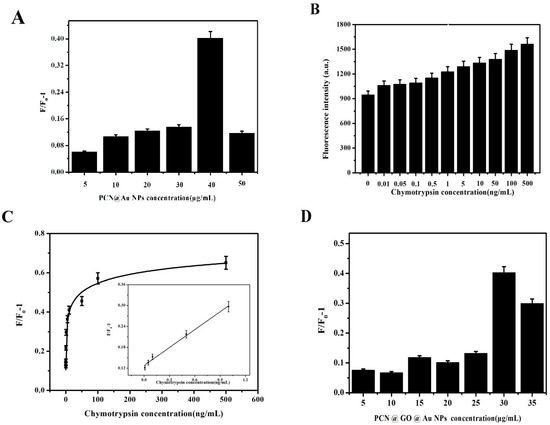 In total, 40 μL CuNC-P solution was added to the system; then, different concentrations of CuNC-P were added to the PCN@AuNPs composite nanomaterial solution (5, 10, 20, 30, 40, and 50 μg mL−1). The intensity of fluorescence was F0. Then, 10 ng mL−1 chymotrypsin was added, and the fluorescence intensity was measured as F after 30 min. The change in fluorescence intensity was F/F0-1. This is shown in Figure 3A. The change in fluorescence intensity was the maximum at the concentration of 40 μg mL−1 NPs. In total, 40 μg mL−1 PCN@AuNPs was selected for use in the following experiments.