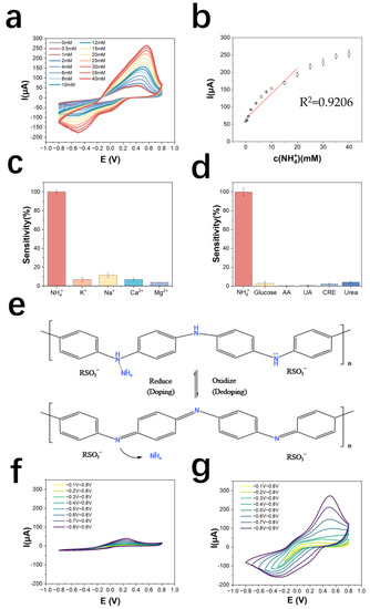 From the above experimental results, it can be inferred that the electro-polymeried PANI: PSS electrode exhibits selectivity for NH4+ under the condition of local enrichment of hydrogen ions subjected to changes in the applied potential causing the redox reaction of PANI. The enrichment of hydrogen ions by PSS makes some of the doping sites of PANI doped by hydrogen ions and obtain electrochemical activity, at this time the doping sites of polyaniline are still vacant, and NH4+ in solution can dope PANI, which makes the number of carriers of PANI increase, and the conductivity is further improved, which shows the increase in redox current, and the dynamic doping/dedoping of NH4+ by PANI: PSS. The mechanism is shown in Figure 3e. The process of doping/dedoping of PANI: PSS by NH4+ can be shown by Equation (1), and it can be considered that PANI: PSS has dynamic selectivity for NH4+.