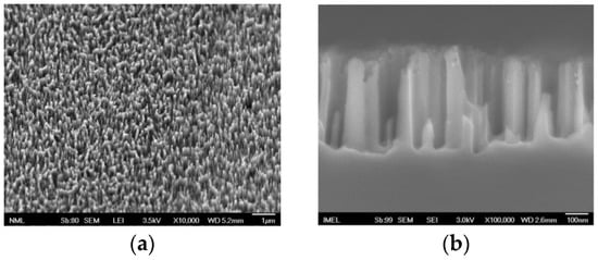 In Figure S1, the UV-vis absorption spectra of bare SiNWs and SiNWs/Ag nanoparticles are presented. The absorption spectra were obtained from the respective diffuse reflection spectra [33,34] by applying the standard Kubelka–Munk method [58]. As shown, the absorption of substrates with bare SiNWs is stronger at wavelengths greater than 350 nm (VIS light), while substrates with Ag nanoparticles on top have significantly higher absorption at UV.