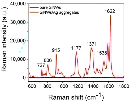 SERS spectra received from surfaces with bare SiNWs (black line) or SiNWs decorated with Ag nanoparticles after incubation with a 30 μg/mL aqueous CV solution using a laser at 532 nm.