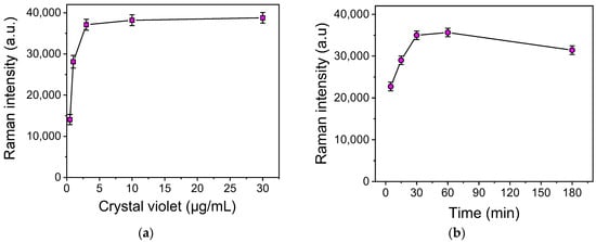The first parameter optimized was the concentration of CV in the solution used to modify the SiNWs/Ag nanoparticles’ substrates. For this purpose, aqueous solutions of CV at concentrations of 1, 3, 10, and 30 μg/mL were incubated with the substrates for 3 h, and then the Raman spectra were acquired using a laser at 532 nm. As shown in Figure 3a, the Raman intensity increased as the CV concentration increased, and maximum plateau values were reached for concentrations equal to or higher than 3 μg/mL. Thus, this concentration was selected for further experimentation.