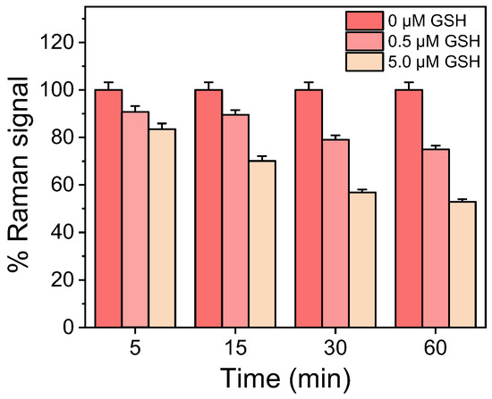 Once the concentration of CV solution and incubation time with the SiNWs/Ag nanoparticles substrates were established, the incubation time with the GSH solutions was also determined. Therefore, aqueous solutions of GSH at concentrations of 0.5 and 5 μM were incubated with substrates modified with CV for 5, 15, 30, and 60 min. In Figure 4, the percentage signals obtained from surfaces incubated with 0.5 and 5 μM GSH to the signal obtained from surfaces incubated with distilled water (zero GSH calibrator) are presented. As shown, the percentage signal drop with respect to the zero calibrator increased as the incubation time increased up to 30 min. The percentage signal drop regarding the calibrator containing 0.5 μΜ GSH with respect to zero calibrator signal was ~9% for 5 min incubation and reached 21% when the incubation time increased to 30 min. Further increases in the incubation time did not significantly improve the assay sensitivity (the percent signal drop for the 0.5 μΜ GSH solution was 25% after 60 min of incubation). Thus, a 30 min incubation of CV-modified surfaces with the GSH solutions was adopted in the final protocol.