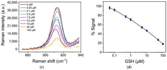 On the other hand, following the optimized protocol for the indirect determination of GSH on substrates modified with CV, the detection sensitivity of GSH was dramatically improved. Ιn Figure 5b, the spectra received from SiNWs/Ag nanoparticle substrates modified with CV prior to the incubation with GSH calibrators with concentrations ranging from 0 to 100 μΜ are presented. In this case, the signals corresponding to Raman spectrum peaks of CV at 727, 806, 915, 1177, 1371, 1538, and 1622 cm−1 were reduced inversely proportional with the GSH concentration. Amongst the characteristic peaks of CV, the intensity of the peak at 915 cm−1 was selected for the creation of the GSH calibration curve, and this particular spectral range is presented in Figure 5c. The selection of the peak was based on the fact that its intensity showed a higher percentage change with respect to the changes observed for the other peaks when the GSH concentration changed. Taking into account the Raman signal value at the peak, the percentage signal drop that corresponded to the different concentrations of GSH with respect to the signal obtained from surfaces that reacted with the zero calibrator (i.e., in absence of GSH) was calculated and plotted against the GSH concentration in the calibrators. A typical calibration curve is depicted in Figure 5d. The limit of detection was calculated as the GSH concentration that corresponded to a percent value equal to 100–3SD of 10 repetitive measurements of the zero calibrator, and it was 50 nM. Thus, compared to the method of GSH detection through its direct incubation of the SiNWs/Ag nanoparticles substrates, an enhancement factor of at least 103 was achieved regarding the assay’s analytical sensitivity.